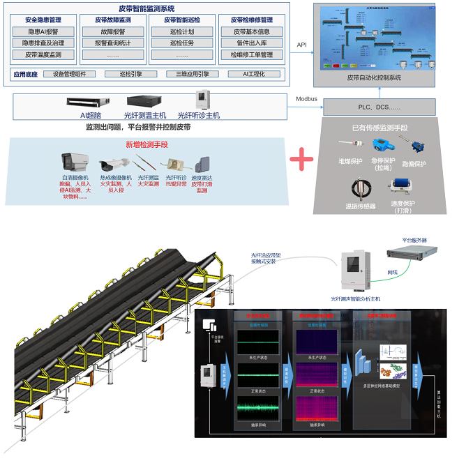 皮带智能监测系统集成热成像、雷达、光纤及 AI 技术,可实时监测皮带火灾、跑偏、打滑、托辊故障等异常状态。通过声纹分析与振动特征提取算法,托辊故障检出率超 97%,且能联动降温灭火装置预防火灾;AI 平台可分析多传感器数据实现智能预警,同时采用截面流量雷达技术,实时监测皮带物料流量,为生产调度提供数据支持。